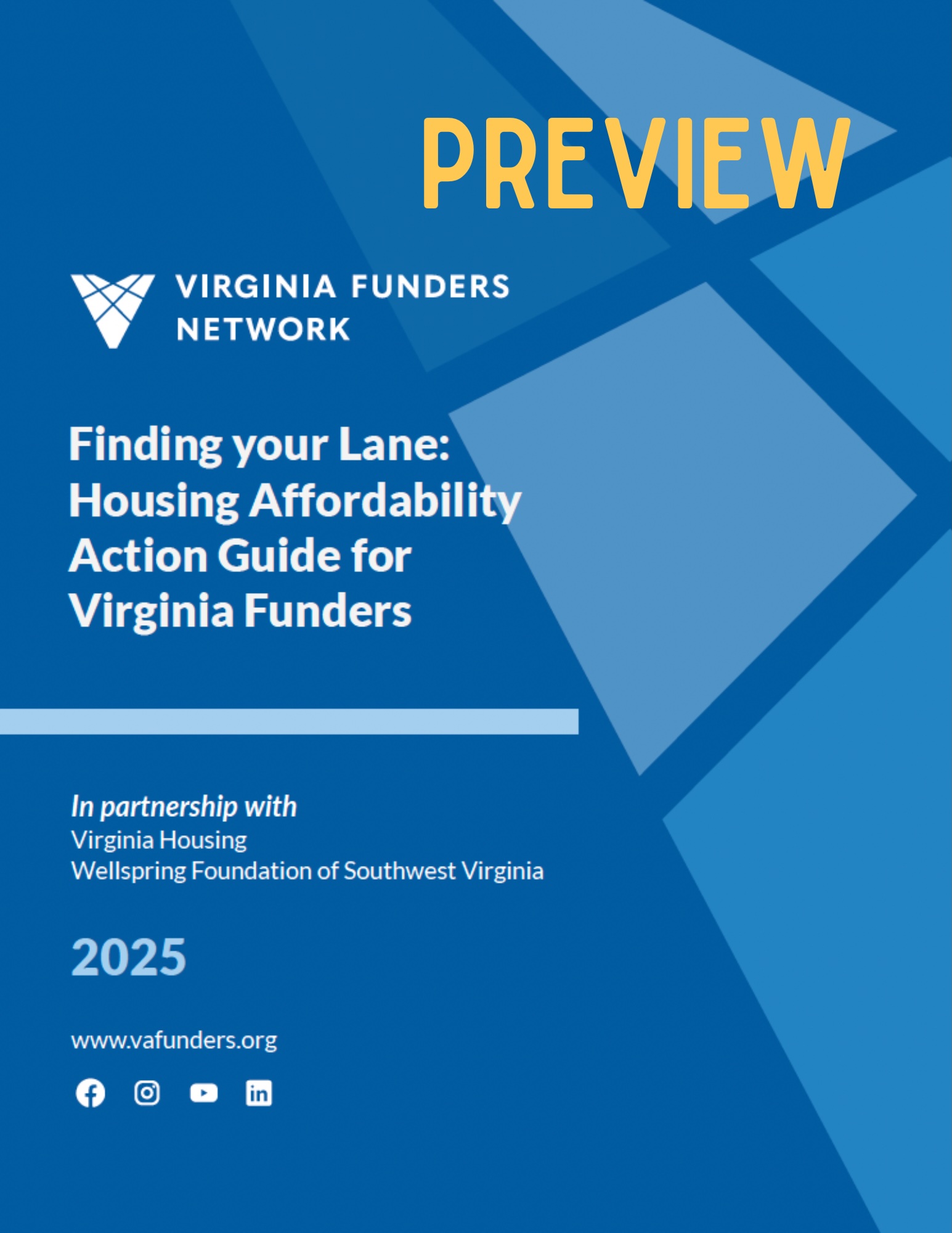 VFN is proud to announce the recent release of Finding Your Lane: Housing Affordability Action Guide for Virginia Funders, a publication sponsored by Virginia Housing and the Wellspring Foundation of Southwest Virginia, is now available at no cost to VFN Members.